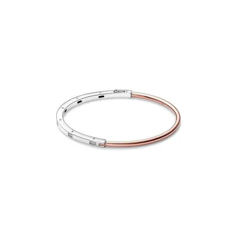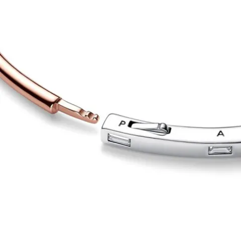 Haz del minimalismo tu mantra con la Pulsera en Dos Tonos y Gemas Pandora Signature. Esta pulsera minimalista se ha creado con dos acabados metálicos: plata de primera ley y nuestra aleación única de metales un con recubrimiento en oro rosa de 14k. El perfil de la banda pasa de cuadrado a redondo; la mitad cuadrada se ha embellecido con brillantes gemas talla baguette separadas de manera uniforme, mientras que la mitad redondeada presenta un cálido tono. Las gemas talla baguette van acompañadas por el logotipo grabado en el lateral. La bisagra única y el cierre de clic hacen que esta pulsera rígida de Pandora sea fácil de poner y quitar. Llévala sola como una joya llamativa o combina varias para crear un look más atrevido.
