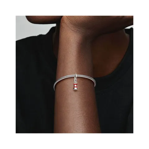 Brilla intensamente dondequiera que estés con el Charm Colgante Faro que brilla en la oscuridad. Embellecido con rayas esmaltadas a mano en color rojo y detalles realistas como ventanas recortadas, un mirador y un cristal que brilla en la oscuridad las ventanas y un corazón recortado en la parte inferior. Tradicionalmente utilizados para guiar a los barcos a casa de forma segura por la noche, el faro es un recordatorio de que hay que mantenerse firme y estar siempre al lado de las personas que te necesitan. Llévalo con otros de tus charms de Pandora favoritos para que te sirva de guía todos los días o regálaselo a alguien que represente la esperanza y la seguridad en tu vida.