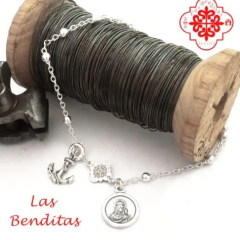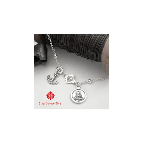 Pulsera en plata de primera ley y circonitas en color con charm ancla y Virgen del Carmen