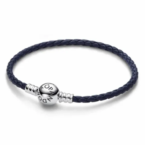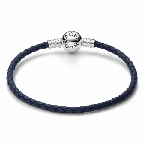 Talla 19 cm. Canaliza las profundidades del océano y la calma de un cielo de medianoche. La Pulsera de Cuero Trenzado Azul con Cierre Redondo de Pandora Moments se presenta en cuero trenzado de color azul profundo y rematada con un cierre redondo en plata de primera ley y tapas roscadas en los extremos en plata de primera ley. Embellécela con hasta 9 charms o charms colgantes para exhibir perfectamente tus charms favoritos.