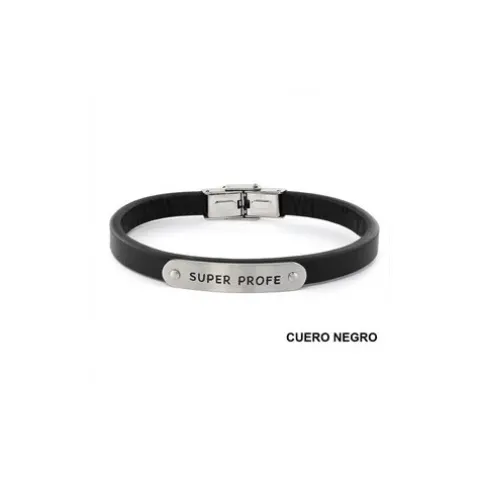Pulsera Super Profe en cuero negro.Chapa y cierre en acero.